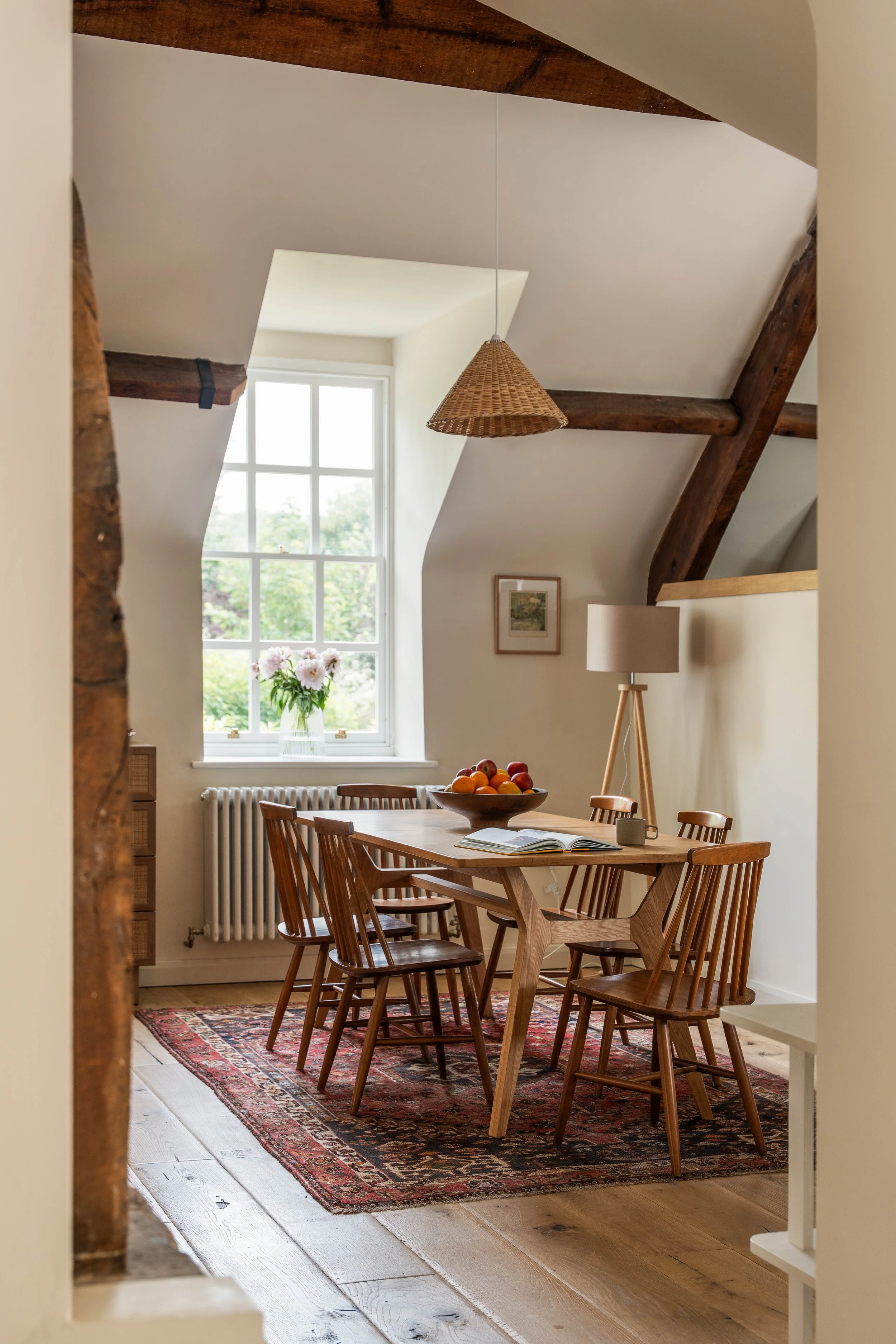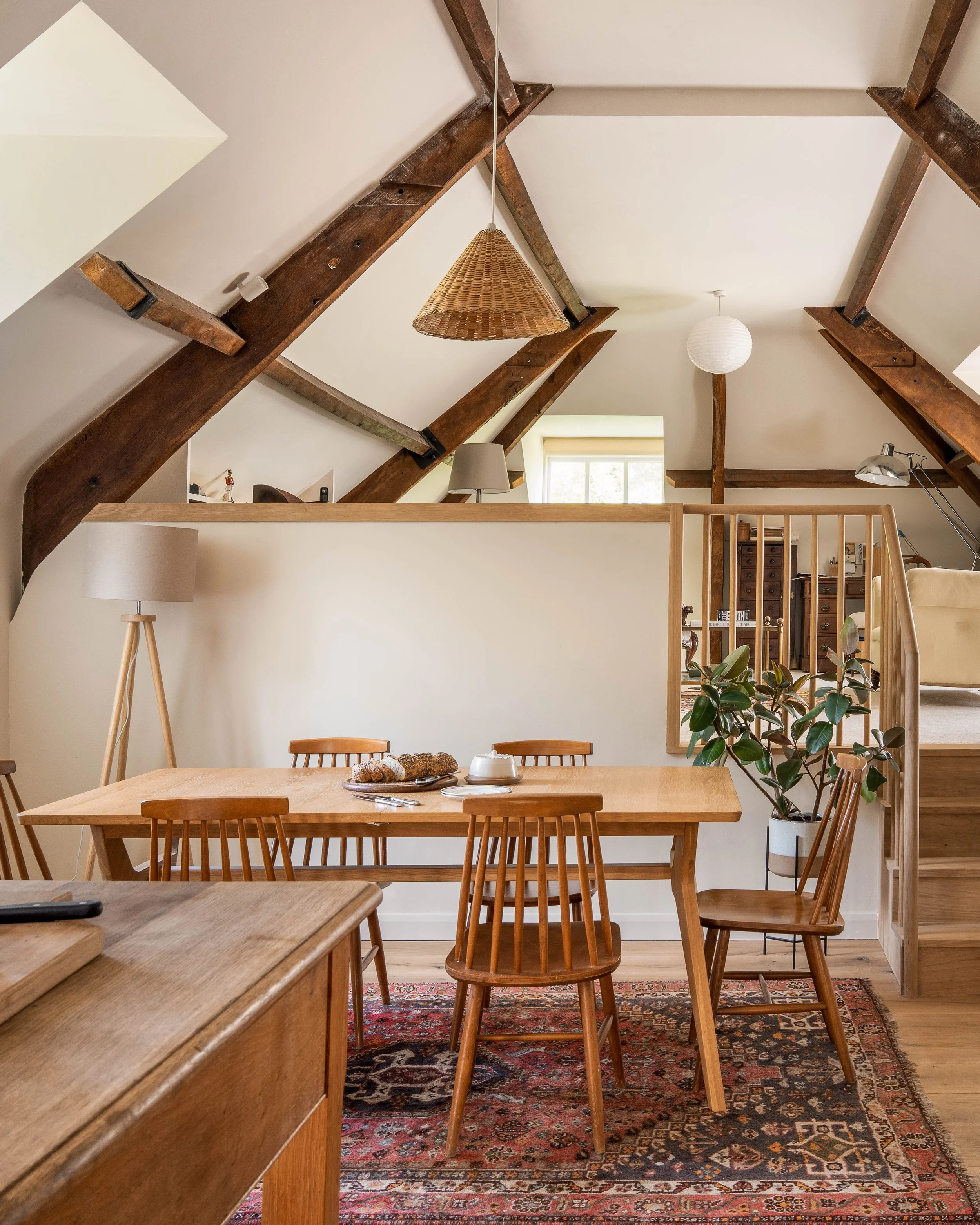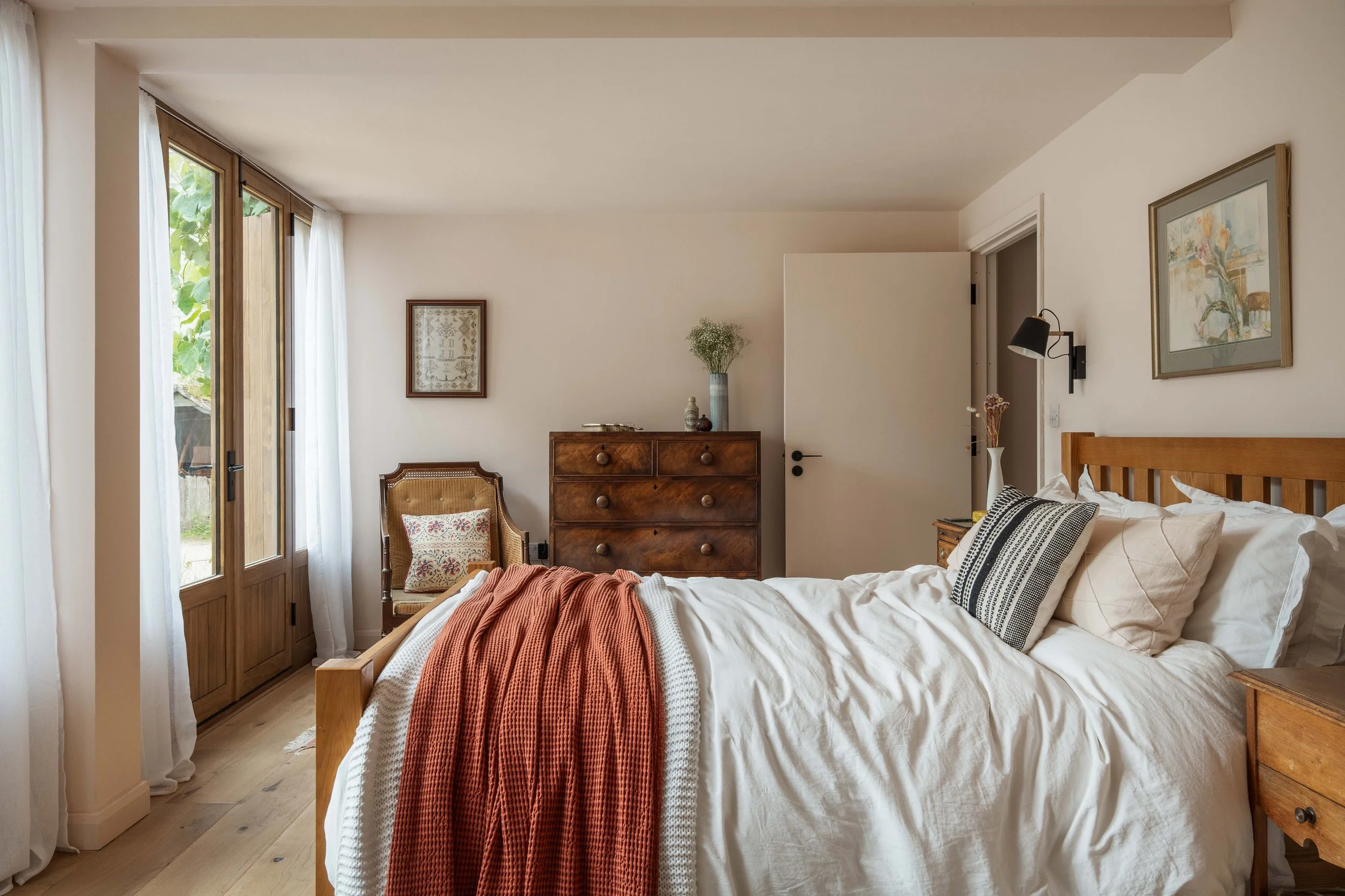 Rather than extending the building, the architects focused on making better use of the existing footprint, converting the former garage into a bedroom and reworking the internal layout to improve accessibility and flow. The resulting spaces combine traditional materials with calm, contemporary interiors while preserving the building’s historic fabric.